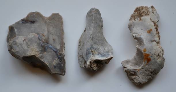 Flints with worked edges for use as tools by Neolithic settlers. Apart from sharp serrate edges made by chipping, the stones have also been carefully chosen so as to fit comfortably in the hand. The tool on the right seems to have been shaped for shaving arrow and spear shafts.