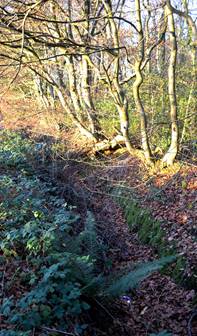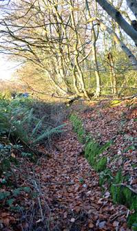 Ancient ditch and banks bordering Lodge Wood, with remains of laid wood-edge on top of the inner bank (right)