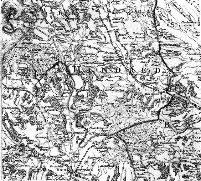 Concomitant with this expansion of the farms was further decimation of the woodlands, which were reduced in the late C17th to something approaching their present extent. Large dense forests might shelter outlaws who raided sheep, pigs, cattle and geese from farmers taking them to market, but even by the time of Jeffreys’s map, the remaining woods were too small and too regularly frequented to present such a danger, and the only people living there were the poor families of bodgers (wood-workers) in temporary huts. Around the turn of the C19 th the remaining woods were further reduced - the western half of Peterley Wood as far as the Wycombe road was cleared; woodland south of Peterley which once reached to Kingshill was reduced to a tiny fragment called Crook's Wood; similar extensive woods on top of Denner Hill were being gradually removed; four-fifths of Lodge Wood on the east side became fields.