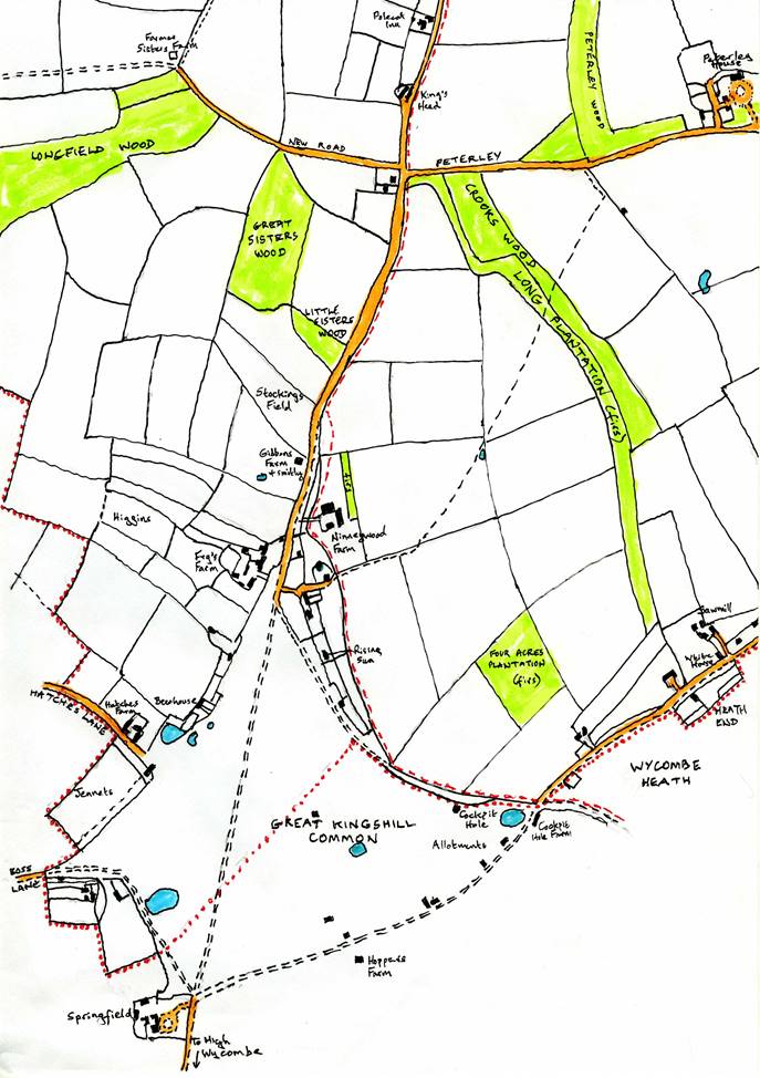 We now return southwards down the common back to Peterley andaim for the crossroads at the road to Wycombe.