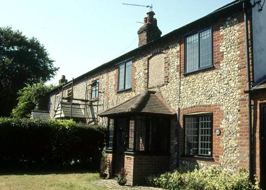 There is a small garden encroachment on the common extending the front garden of this house, which is set back from the edge of the common, and other narrow encroachments follow – two orchards sandwiching another new house (1830s flint with panels of blue header brick, patterns in red brick, and corner quoins of Denner Hill stone), all the property of William Nash. The house [Red Lion] is leased by William Collins (1811) who sells beer and other items and is a small farmer, as well as doing work for other farmers. He used to manage Fry’s Farm for the Masons and now leases Hoppers from them. His daughter Mary Ann lives at Hoppers and is in charge there, even though she is only thirteen. He is from Marlow originally, where his father John is a general dealer, and his wife Fanny is from Chesham. They have two children still at home.