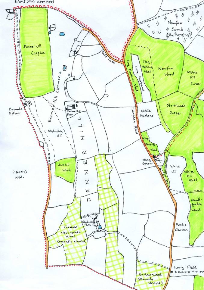 On the south side of this track is an area of scrub, the Hangings, which reaches almost to Nanfans. Here the trees were felled a few decades ago and sown to crops, but it has been abandoned as Stocklands and Middle Hill Furzes were. Land north of the track has long been cleared for fields as part of the Nanfan farm, except alongside the Hampden Road, where the steep slope is still wooded (Eldridge Grove), but this is again Carrington land. All the way up Hampden Road from before the track up the Hangings we have been following the western boundary of the new Prestwood Parish. On the left hand side a road (Rolls Lane) goes up to the top of Denner Hill and this marks the northern boundary of an extension of Prestwood Parish that includes the settlements on the hill and down to the valley on the other side. Here it follows the Hughenden/Hampden civil parish boundaries. ["Roles's", "Rolls" or "Rose" Lane has also been applied to what is now Hampden Road where it runs below Denner Hill.]